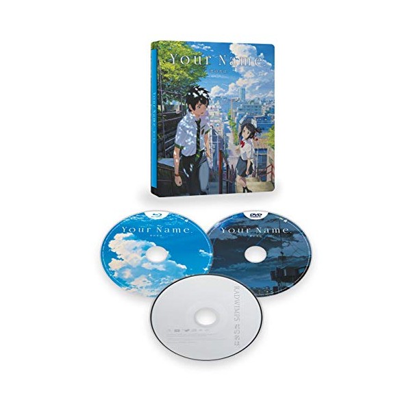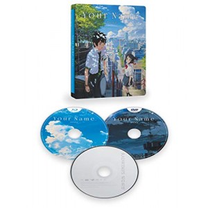 | Edition limitée en boîtier métal SteelBook, comprenant : - le Blu-ray du film - le DVD du film - le CD de la BO par Radwimps Pistes du CD : 01. Yume Tôrô (02'09") 02. Mitsuha no Tsûgaku (01'07") 03. Itomori Kôkô (01'48") 04. Hajimete no Tôkyô 01'16") 05. Akogare Cafe (01'29") 06. Okudera Senpai no Têma (02'06") 07. Futari no Ihen (02'36") 08. Zen Zen Zense (movie ver.) (04'44") 09. Goshintai (03'24") 10. Dêto (04'03") 11. Akimatsuri (01'06") 12. Kioku wo Yobiokosu Taki (01'40") 13. Hida Tanbô (01'29") 14. Kieta Machi (01'55") 15. Toshokan (01'42") 16. Ryokan no Yoru (01'29") 17. Goshintai he Futatabi (02'21") 18. Kuchikamizake Torippu (02'55") 19. Sakusen Kaigi (02'20") 20. Chô Chô Settoku (02'45") 21. Mitsuha no Têma (04'02") 22. Mienai Futari (00'50") 23. Katawaredoki (02'47") 24. Supâkuru (movie ver.) (08'54") 25. Dêto 2 (02'09") 26. Nandemonaiya (movie edit.) (03'15") 27. Nandemonaiya (movie version) 05:44 40 minutes de bonus : "Reportage sur la promotion japonaise". En présence du réalisateur (Makoto Shinkai), Kamiki Ryunosuke (Taki), Kamishiraishi Mone (Mitsuha) (21' - VOST) "Filmographie de Makoto Shinkai" : Documentaire vidéo sur l'oeuvre du réalisateur commenté (10' - VOST) "Theme Song en Japonais par RADWIMPS" : Générique d'ouverture sans sous-titres "Theme Song en Anglais par RADWIMPS" : Version anglaise du générique chanté par le groupe 4 bandes-annonces (VF/VOST/VO) Teaser japonais |