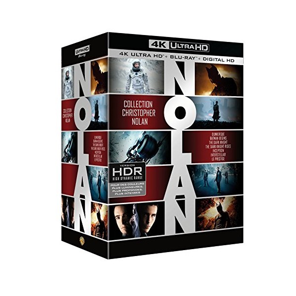 | Contient : - "Dunkerque" (Ultra HD Blu-ray 4K en HDR + 2 Blu-ray - ratio 2.20 et 1.78) - "Interstellar" (Ultra HD Blu-ray 4K en HDR + 2 Blu-ray - ratio 2.40 et 1.78) - "Inception" (Ultra HD Blu-ray 4K en HDR + 2 Blu-ray) - "Batman Begins" (Ultra HD Blu-ray 4K en HDR + 2 Blu-ray) - "Batman - The Dark Knight, le Chevalier Noir" (Ultra HD Blu-ray 4K en HDR + 2 Blu-ray - ratio 2.40 et 1.78) - "Batman - The Dark Knight Rises" (Ultra HD Blu-ray 4K en HDR + 2 Blu-ray - ratio 2.40 et 1.78) - "Le Prestige" (Ultra HD Blu-ray 4K en HDR + 2 Blu-ray) Dunkerque Blu-ray des bonus (HD - 109'37" - VOST) : Création : - Retour sur le passé (7'49") - Dunkerque (5') - Les défis du tournage (3'36") - Les choix de caméra (5'52") Sur Terre : - Reconstruire la digue (5'59") - Les soldats sur la plage (5'18") - Les uniformes (5'21") Dans les airs : - Filmer dans les airs (12'31") - Dans le cockpit (5'59") En Mer : - Constituer une flotte navale (3'50") - À bord du Moonstone (5'55") - Filmer en mer (13'43") - Au coeur des naufrages (7'29") - La petite armada (5'57") Conclusion : - Entretenir le suspense (7'23") - L'esprit de Dunkerque (7'55") Interstellar Blu-ray des bonus (VOST) : "La science d'Interstellar" : émission sur les aspects scientifiques du film (version longue - 50'20") "Préparer un voyage interstellaire" : la genèse du film, ses influences et sa forme narrative (7'49") "La vie dans la ferme de Cooper" : de la ferme à l'espace (9'43") "La poussière" : l'équipe du film face aux tempêtes de sable (2'38") "TARS and CASE" : design et fabrication des deux robots du film (9'27") "Les sons cosmiques d'Interstellar" : la genèse de la musique de Hans Zimmer (13'40") "Les combinaisons spatiales" : la création et le port des combinaisons et des casques (4'31") "L'Endurance" : Nahan Crowley (resp. déco) fait visiter l'imposant plateau du vaisseau Endurance (9'24") "Le tournage en Islande: la planète de Miller / La planète de Mann" : l'équipe du film en Islande pour la création de deux mondes inconnus (12'42") "Le Ranger et Le Lander" : focus sur les deux autres vaisseaux du film (12'20") "Miniatures dans l'espace" : focus sur les impressionnantes maquettes utilisées lors de la séquence d'amarrage (5'29") "La simulation de l'apesanteur" : les différentes façons de simuler l'absence de gravité (5'31") "Phénomènes célestes" : l'utilisation de véritable équations scientifiques pour la création d'effets spéciaux crédibles pour le voyage spatial (13'22") "À travers le temps et les dimensions" : concept et design du Tesseract, utilisant un vrai décor plutôt qu'un écran vert (9'02") "Dernières pensées" : les acteurs et l'équipe du film à propos de leur expérience sur le film (6'02") Teaser et bandes-annonces : - "Lee" (1'52") - "Merveilles" (2'34") - "Mémoires" (2'35") - "Humanité" (2'29") Inception Blu-ray du film : Mode "Extraction", insertion de modules making of en cours de visionnage (HD - 44'11" - VOST) : - L'origine d'Inception - Le château japonais: le rêve s'écroule - Désintégration du Café parisien - Construire une architecture paradoxale - Le train de marchandises - Embuscade dans les rues de la ville - Le bar qui s'incline - Les couloirs en rotation - La forteresse dans la montagne - Simulation de l'apesanteur - Les Limbes : la conception de l'espace des rêves - L'explosion de la forteresse - La musique des rêves - Le partage des rêves Blu-ray des bonus : Les coulisses du film (HD - VOST) : - Les rêves : le cinéma du subconscient (44'29") - Inception : la mission Cobol (14'33") 5.1 la bande originale d'Inception : 10 morceaux de la bande originale du film (DTS-HD MA 5.1 - 38'38") Extras : - Galerie d'art conceptuel (32 dessins) - Archive d'art promotionnel (12 affiches) 3 bandes-annonces (4'50" - VO) 13 spots TV (11'28" - VO) Batman Begins Blu-ray du film : "Au coeur du film" : accès aux coulisses pendant le visionnage du film (lecteur compatible "Bonus View" ou "BD Live" nécessaire) Blu-ray des bonus : "The Dark Knight IMAX Prologue" : les premières minutes de "The Dark Knight" (HD 1080p - DD 5.1 - 1.78 - VOST) Parodie : Jimmy Fallon s'incruste dans le film (5'12" - VOST) "Batman - L'aventure commence" : conception et développement du film, casting du personnage de Batman (14'16" - VOST) "Former le corps et l'esprit" : la transformation de Christian Bale en Batman (12'49" - VOST) "La construction de Gotham City" : la création des décors du film (Gotham City, la Batcave, le Manoir de Bruce Wayne...) (12'48" - VOST) "La cape et le masque" : l'élaboration du nouveau costume (8'18" - VOST) "Batman - Le Voltigeur" : la Batmobile réinventée (13'40" - VOST) "Le chemin de la découverte" : regard sur la première semaine de tournage en Islande (14'14" - VOST) "Sauver Gotham City" : le développement des maquettes et des effets graphiques pour la scène de poursuite en monorail (13'01" - VOST) "La genèse de Batman" : l'incarnation du Chevalier Noir et les influences du film (14'53" - VOST) 3 galeries d'affiches : - 9 affiches US - 14 affiches internationales - 40 concepts d'affiches "Dossiers confidentiels" : les secrets de Batman non révélés dans le film (12 fiches - VF) Discussions autour du scénario avec David S. Goyer (1'57" - VOST) "Batman en numérique" : test du personnage numérique (1'06" - VOST) "Batman Begins - Les cascades" (2'29" - VOST) Bande-annonce (1'13" - VO) Batman - The Dark Knight, le Chevalier Noir Blu-ray du film : (VOST) "Gotham Uncovered : tournage d'une scène" : Christopher Nolan et so équipe dévoilent les secrets de fabrication du film (18 modules HD - 64'10" - VOST) Blu-ray des bonus : "La technologie de Batman" : les gadgets et outils du film (HD - 45'59" - VOST) "Batman démasqué : la psychologie du Chevalier Noir" : analyse de la psychologie de Bruce/Batman (HD - 46'02" - VOST) "Gotham Tonight" : 6 journaux télévisés de Gotham (HD - 42'41" - VOST) Galerie photos : - les cartes de Joker (72') - l'art concept (57